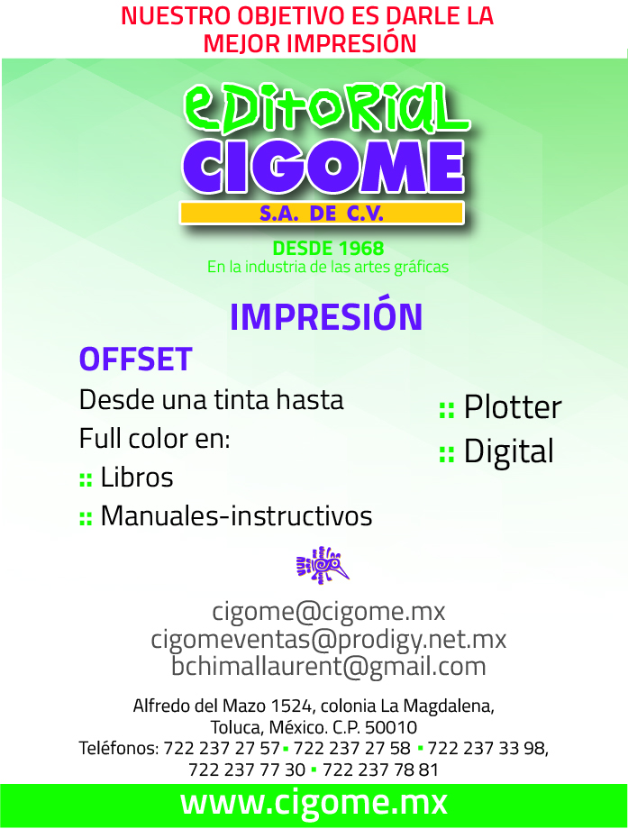 Editorial CIGOME somos una empresa con 52 años de experiencia en el ramo de las Artes Gráficas, realizando Impresiones desde una tinta hasta full color en maquinas como Offset y Forma continua como por ejemplo, Libros, Manuales- Instructivos, Trípticos, Libretas y Papelería General. También contamos con impresiones Digitales a gran formato, 3D, HOT STAMPING, HOT MEAL, Laser y Serigrafia. Con esta tecnología podríamos realizar Etiquetas, Barniz al registro, lonas, Barner, Impresiones en Tela, Promocionales, Recorte de Vinil, Cortado Router SNC, Anuncios Luminosos. Nos ponemos a sus ordenes con todo lo que soliciten y en material que requiera en impresiones. Cumpliendo con sus estándares de CALIDAD y una atención 100% PERSONALIZADA.